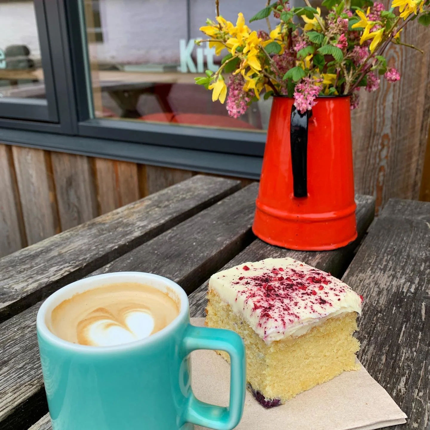Coffee, cake and flowers outside the Carry Farm Coffee Bar