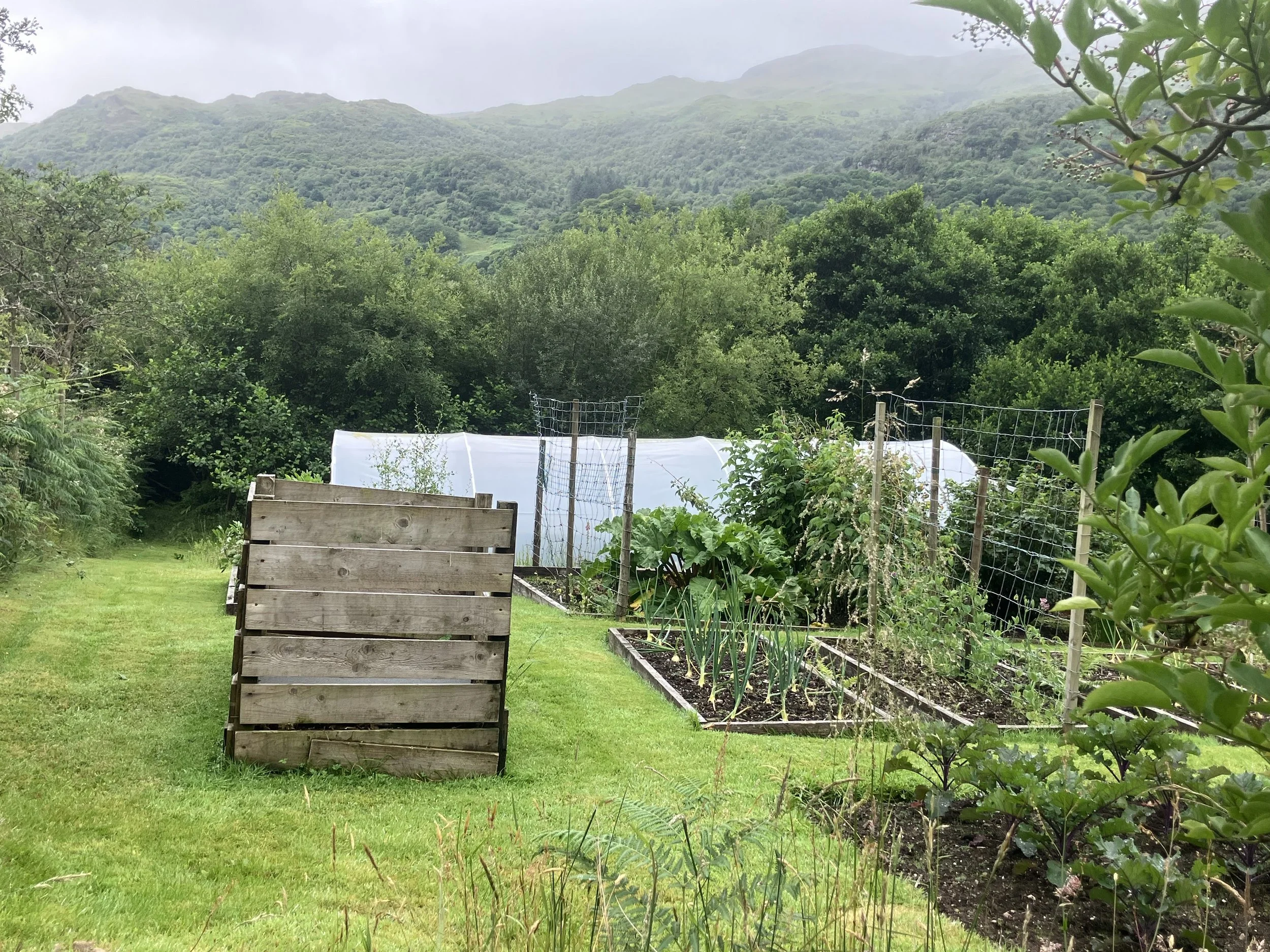 Vegetables, fruit, polytunnel and compost bins