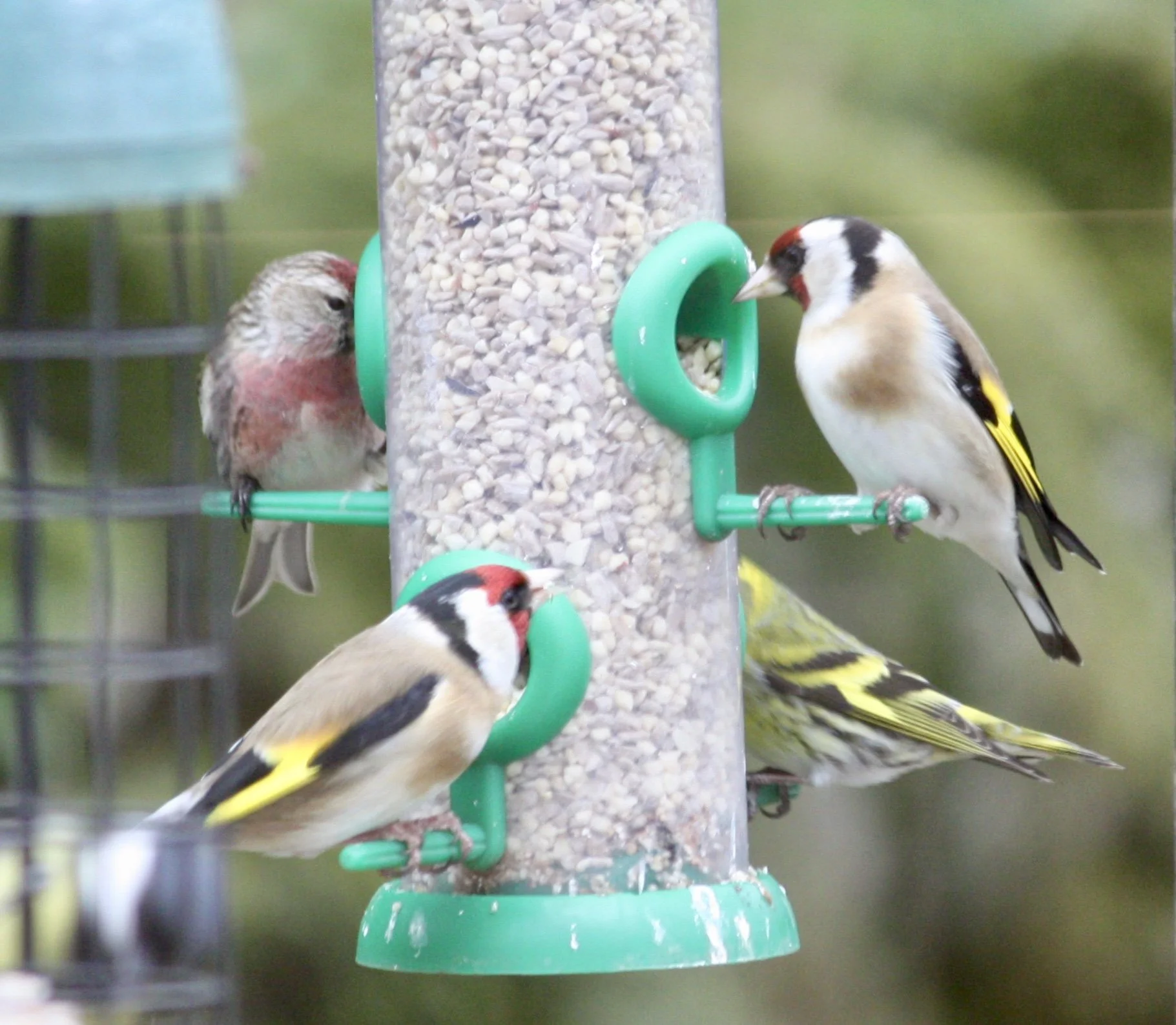 Goldfinches, a siskin and a redpoll on the bird feeder