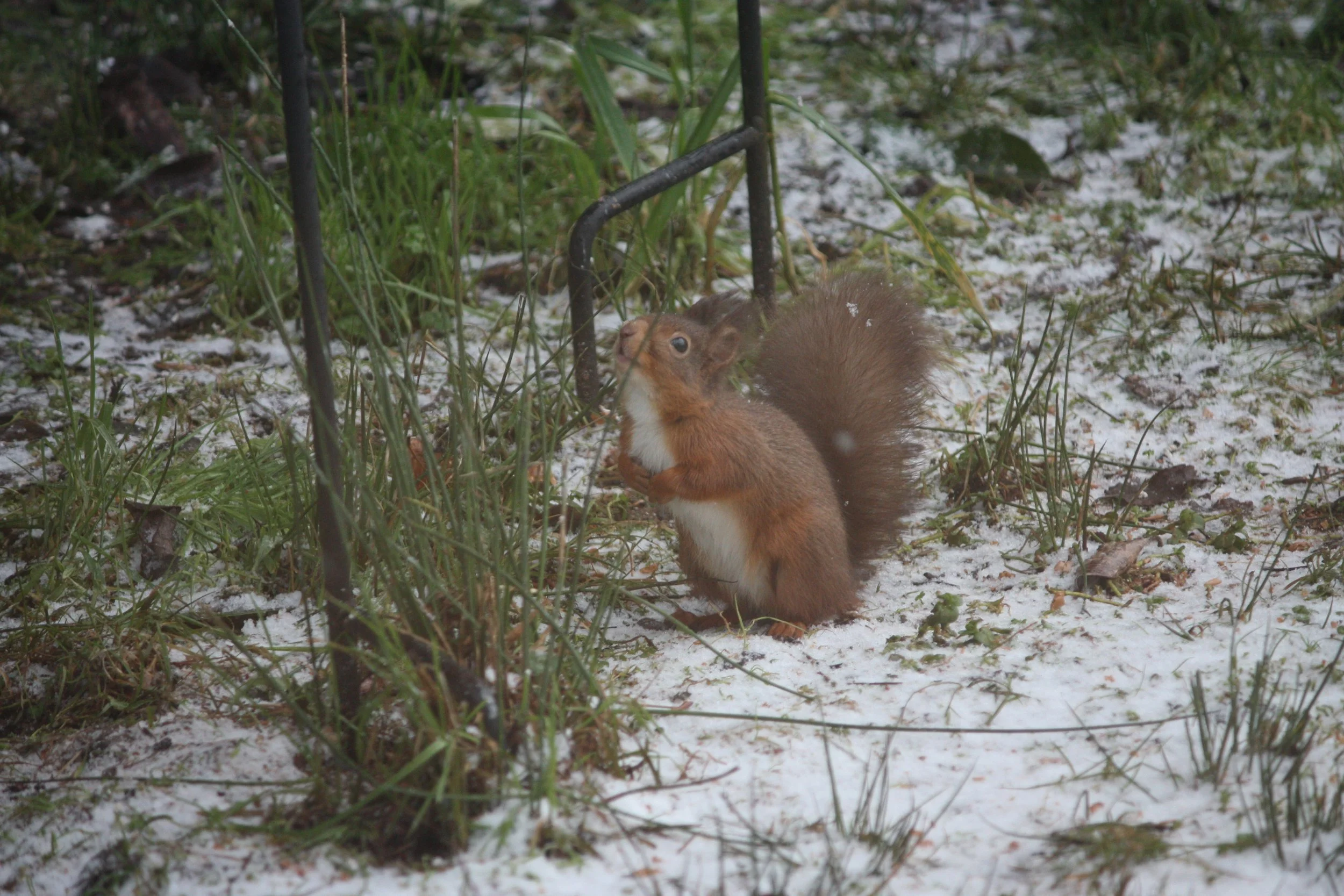 Red squirrel at the bottom of the bird feeder looking at the nuts!